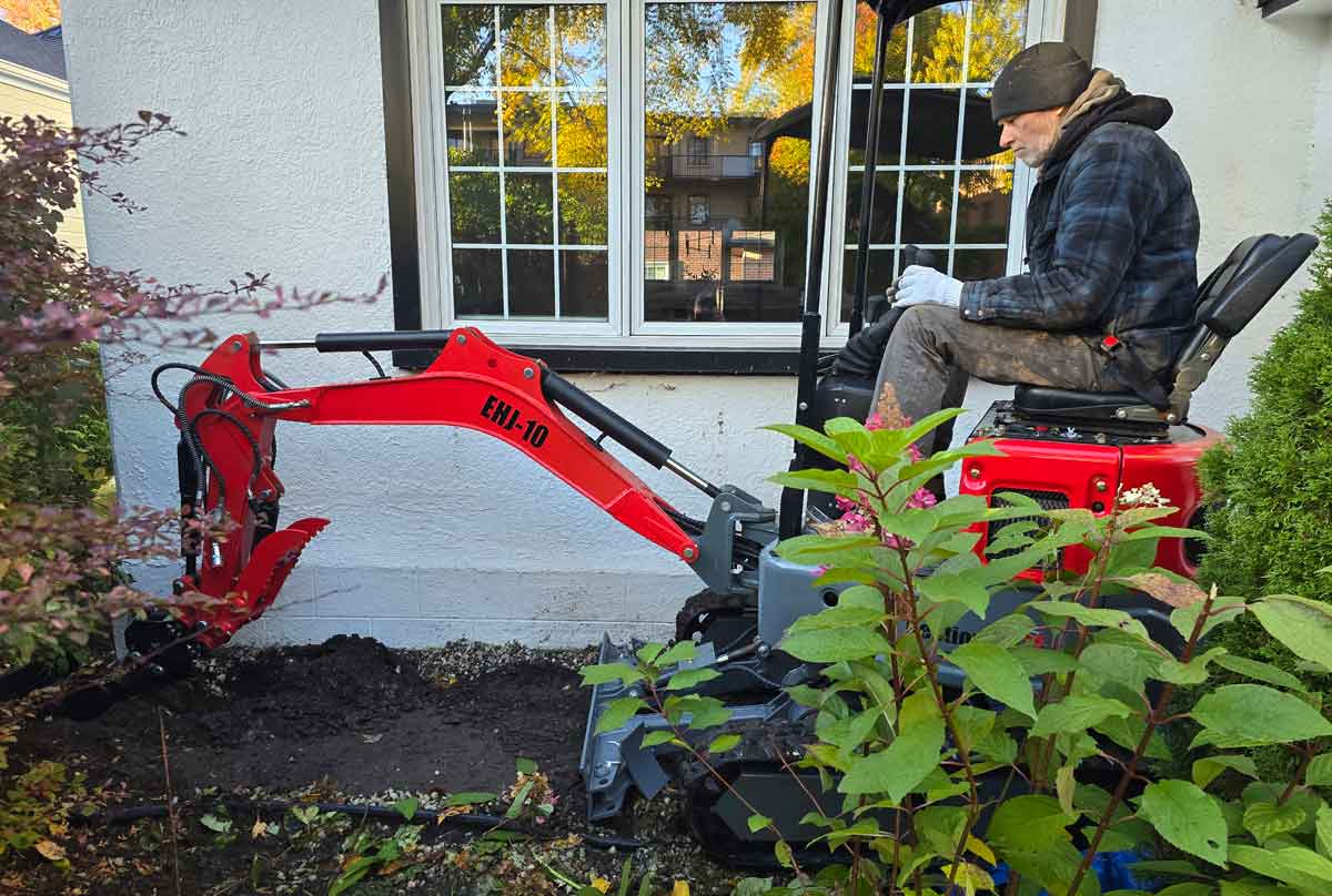 CFM possède une mini excavatrice pour creuser dans des espaces restreints, la réparation de fondation, l’ajout de fenêtre et margelle le cassage de béton et le creusage avec tarrière.